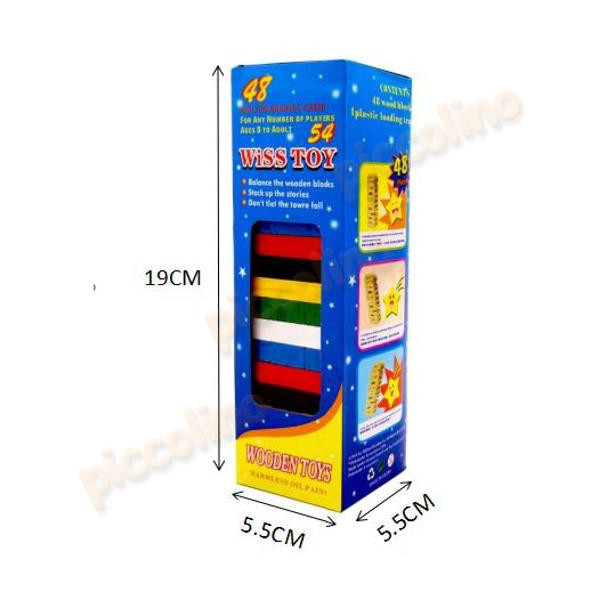 Súprava obsahuje 54 drevených blokov a 4 hracie kocky. Hráči postavia z blokov vežu, pričom každé poschodie sa skladá z troch blokov uložených kolmo na predchádzajúce. Na stabilnú konštrukciu je dôležité hrať na tvrdom a rovných povrchu.